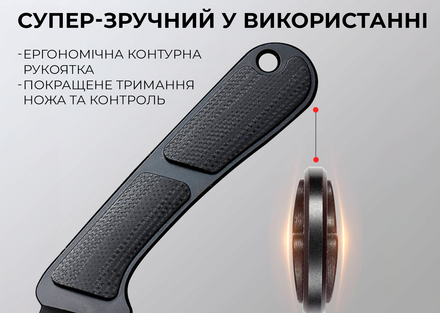 По обидва боки руківʼя закріплено декілька накладок зі склопластику G10, який мінімізує ковзання конструкції в долоні завдяки шорсткій поверхні. До того ж матеріал не боїться впливу температурних перепадів, несприйнятливий до механічних пошкоджень та не вбирає запахи.