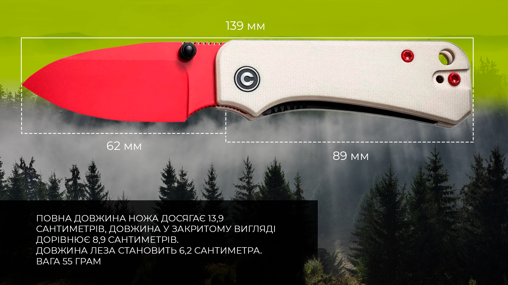 Рукоятка виготовлена зі склотекстоліту G10. Це міцний та зносостійкий матеріал. Довжина повна ножа досягає 13,9 сантиметра, довжина у закритому вигляді дорівнює 8,9 сантиметрів. Важить зручний ніж 55 грам.