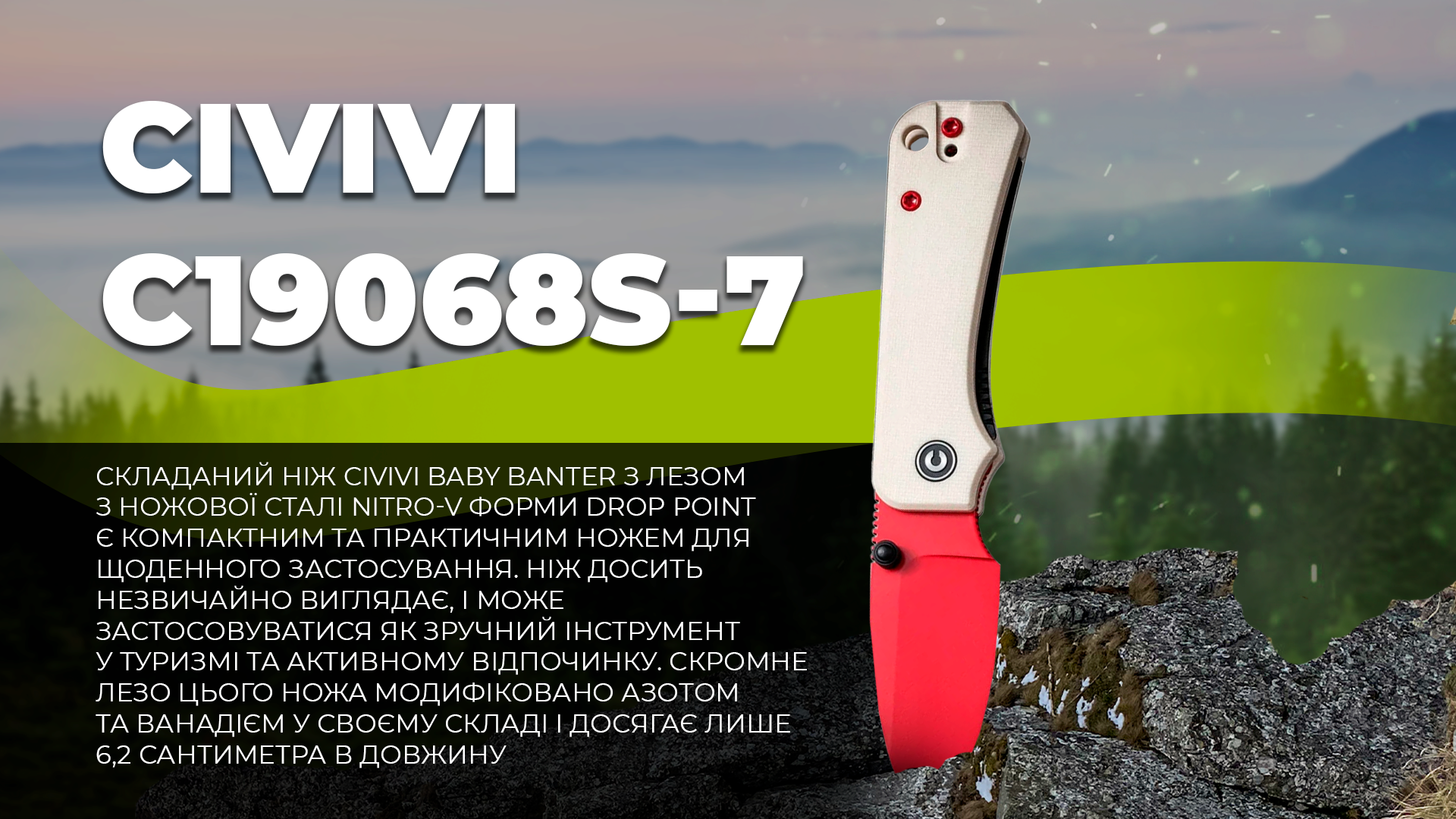 Складаний ніж Civivi Baby Banter C19068S-7 є компактним та практичним ножем для щоденного застосування. Модель була розроблена Беном Петерсеном. Має оригінальний зовнішній вигляд, мініатюрний клинок, а ручка – міцна та зносостійка. Довжина повна ножа досягає 13,9 сантиметра, довжина у закритому вигляді дорівнює 8,9 сантиметрів. Важить зручний ніж 55 грам.