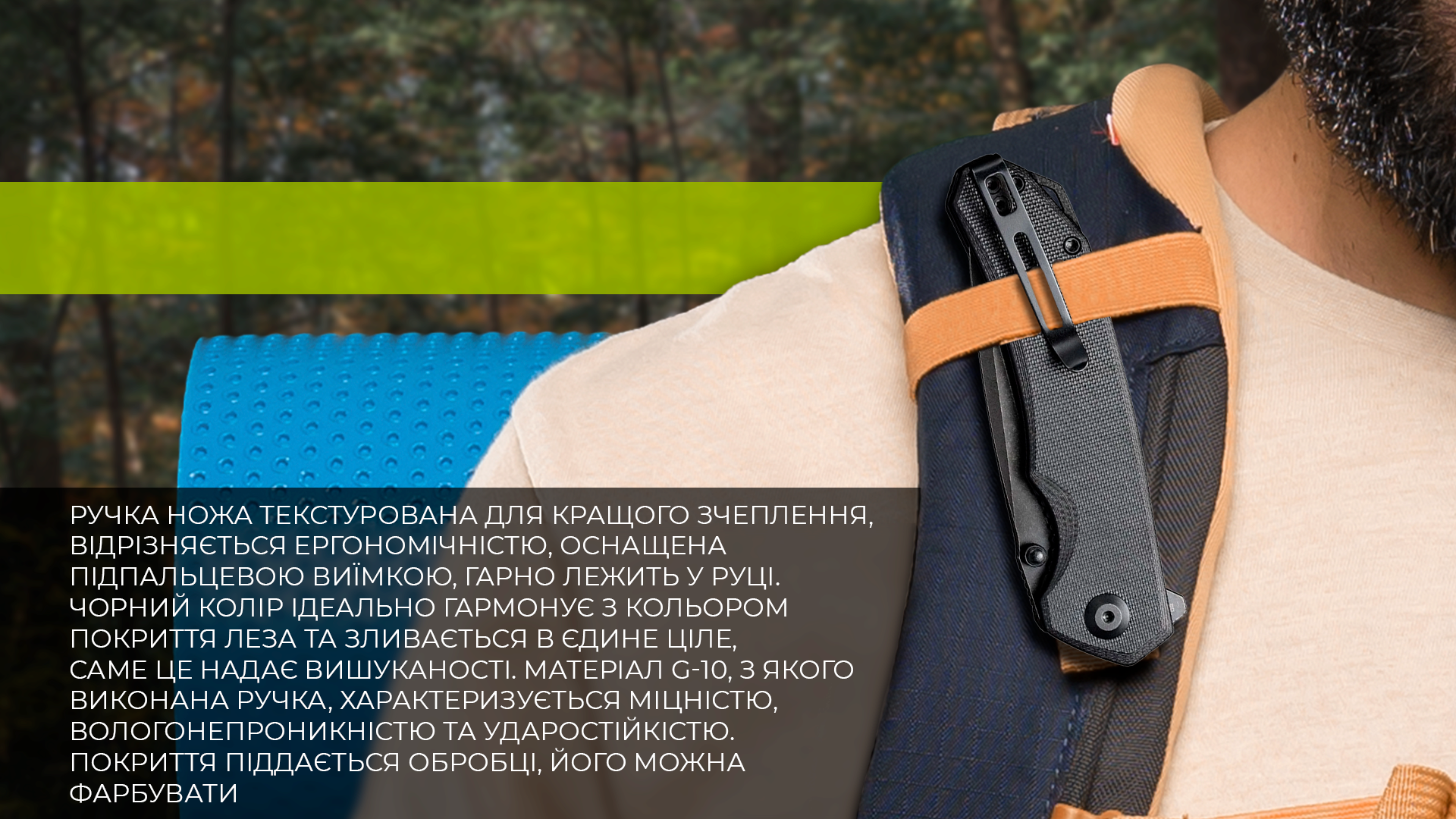 - чорна ручка G-10 зі зручними виїмками для пальців для гарного захоплення;