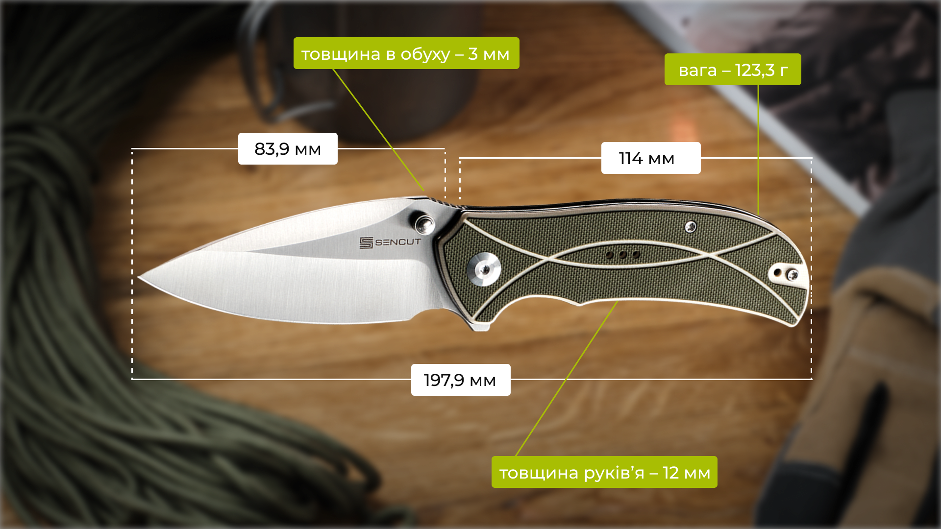 По обидва боки руківʼя закріплені рельєфні накладки зі склопластику G10, який відповідає за міцний хват. Матеріал не вбирає вологу та запахи, не тріскається при ударі та перепадах температури, тому інструмент можна використовувати за будь-яких умов, де потрібен надійний та довговічний помічник.