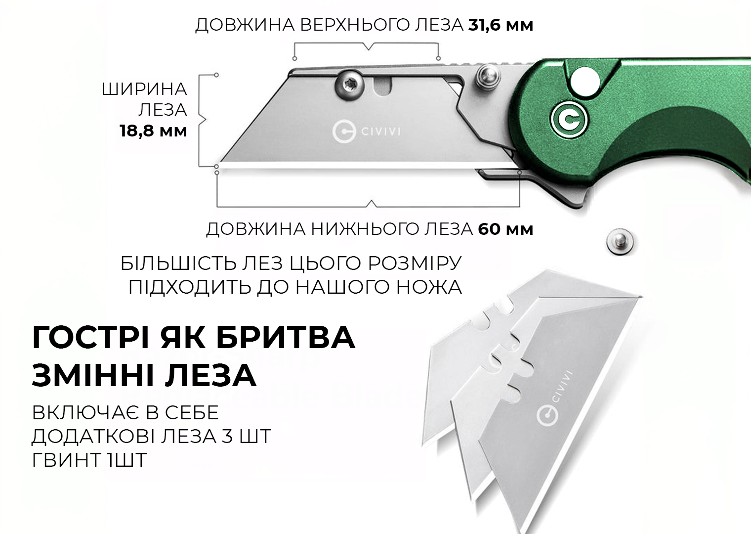 Ця модель є однією з найнезвичайніших в асортименті Civivi, оскільки вона оснащена канцелярським ножем замість класичного клинка. У комплекті є 3 змінні леза. Всі вони виготовлені з нержавіючої сталі 6Cr. Конструкція відкривається 3 способами. Руківʼя з алюмінію доповнене двопозиційною кліпсою на кишеню.