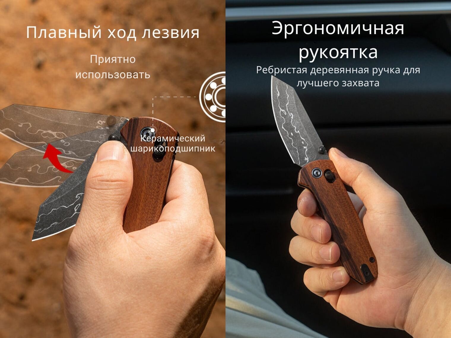 - Рукоять из натурального дерева. Накладки изготовлены из древесины Guibourtia, обладающей отличной устойчивостью к механическим повреждениям, влаге и деформации. Текстура древесины дарит приятные тактильные ощущения и надежный хват для безопасного использования.