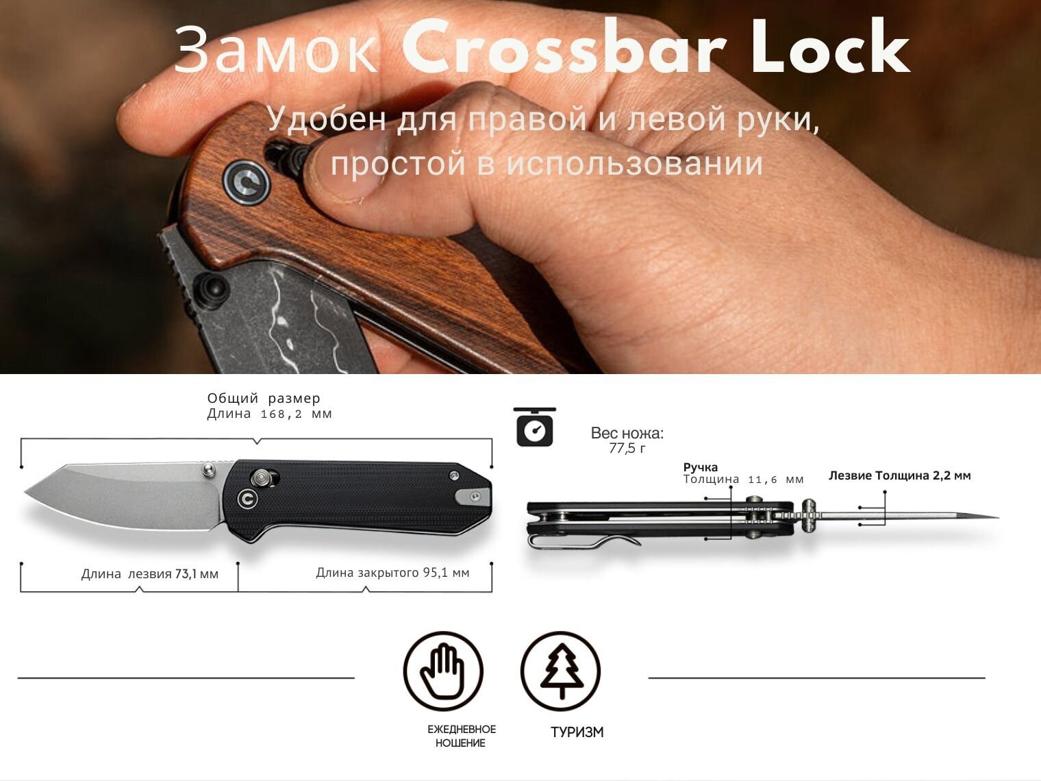 Модель может похвастаться плавным движением клинка благодаря керамическим подшипникам. Конструкция открывается с помощью двухстороннего шпенька в клинке и фиксируется в рабочем положении замком Crossbar Lock, которым легко управлять как правой, так и левой рукой.
