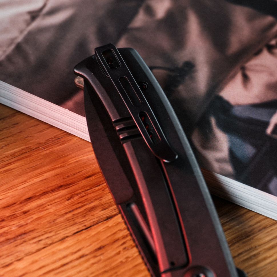 Плашка из микарты с одной стороны минимизирует скольжение ножа в ладони. С другой стороны обнажена стальная конструкция рукояти, дополненная клипсой Tip-Up. Клипса закреплена двумя винтами и не предусматривает смены положения.