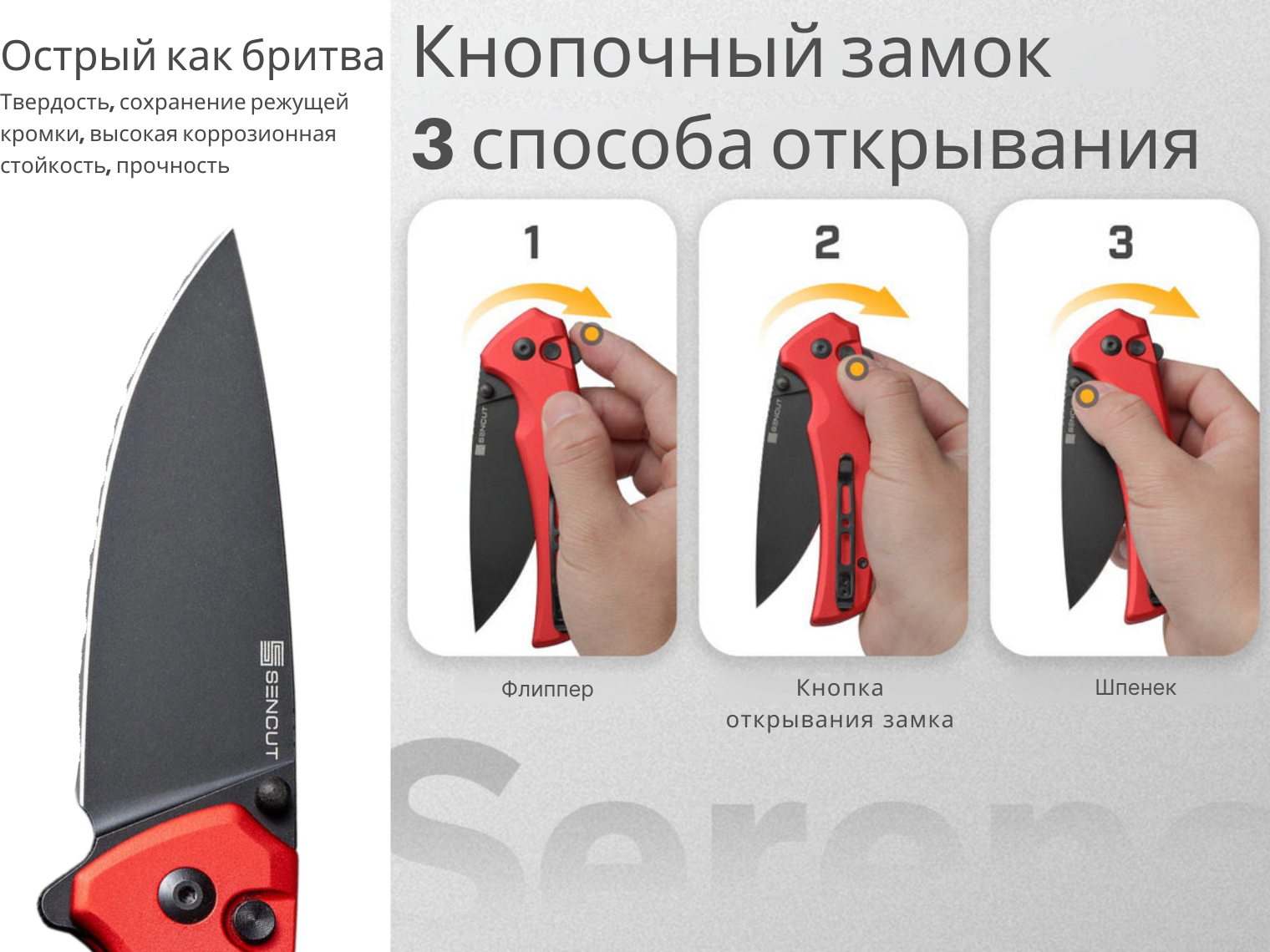 Складная модель Sencut Serene — яркий представитель джентльменского ножа для повседневного ношения, в котором все части конструкции изготовлены из металла. В качестве материала клинка используется нержавеющая сталь D2 твердостью 59-61 HRC, а рукоять изготовлена из легкого алюминиевого сплава обтекаемой формы, которая повторяет изгибы ладони.
