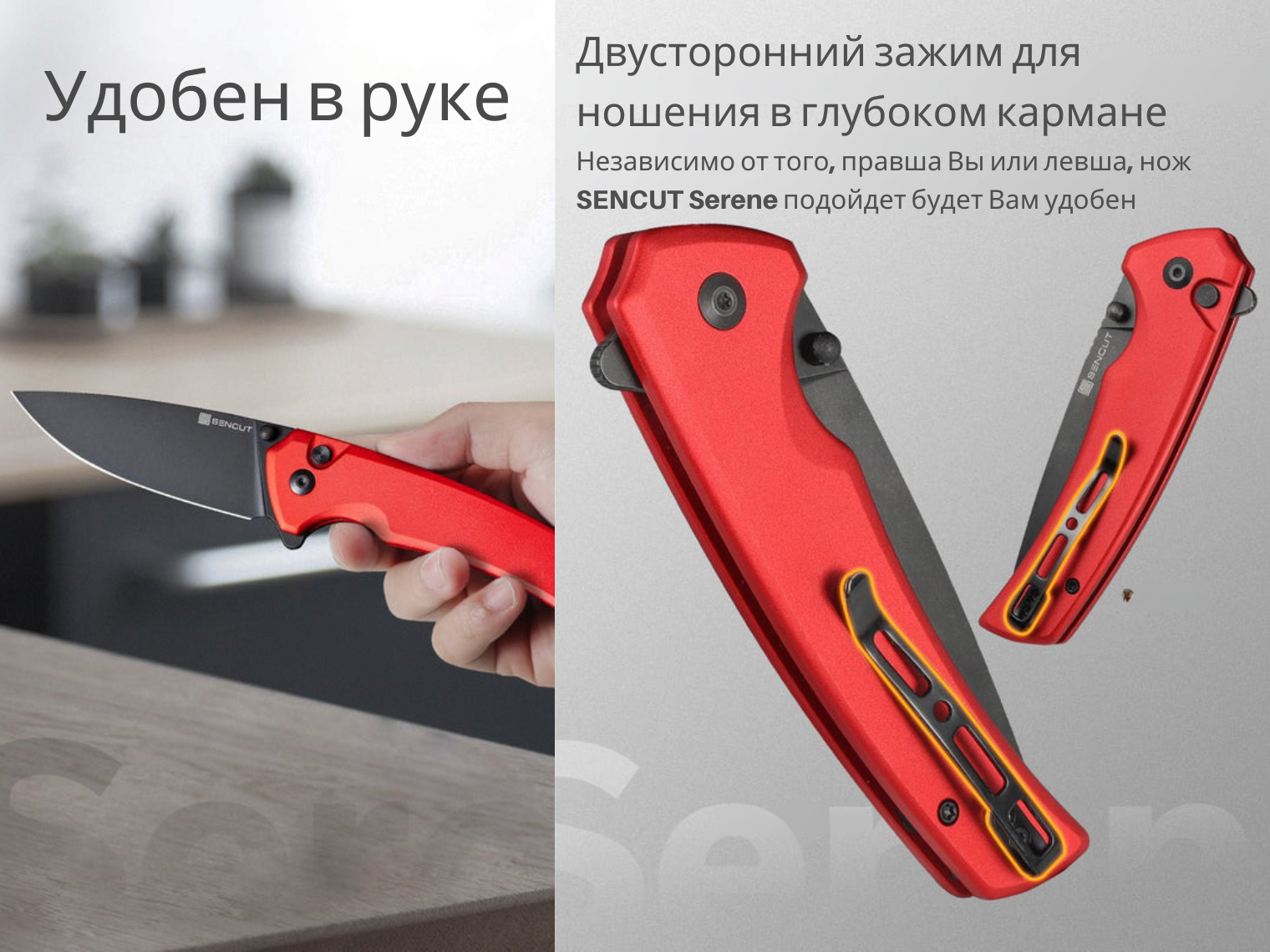 Нож Serene складывается до 119.1 мм. Открытие и закрытие инструмента отличается плавностью — за это отвечает керамический шарикоподшипник, являющийся частью осевого узла. Несмотря на конструкцию, целиком изготовленную из металлов, модель весит 97.3 грамма. Двухпозиционная клипса Tip-Up гарантирует удобную эксплуатацию и ношение как для правшей, так и левшей.