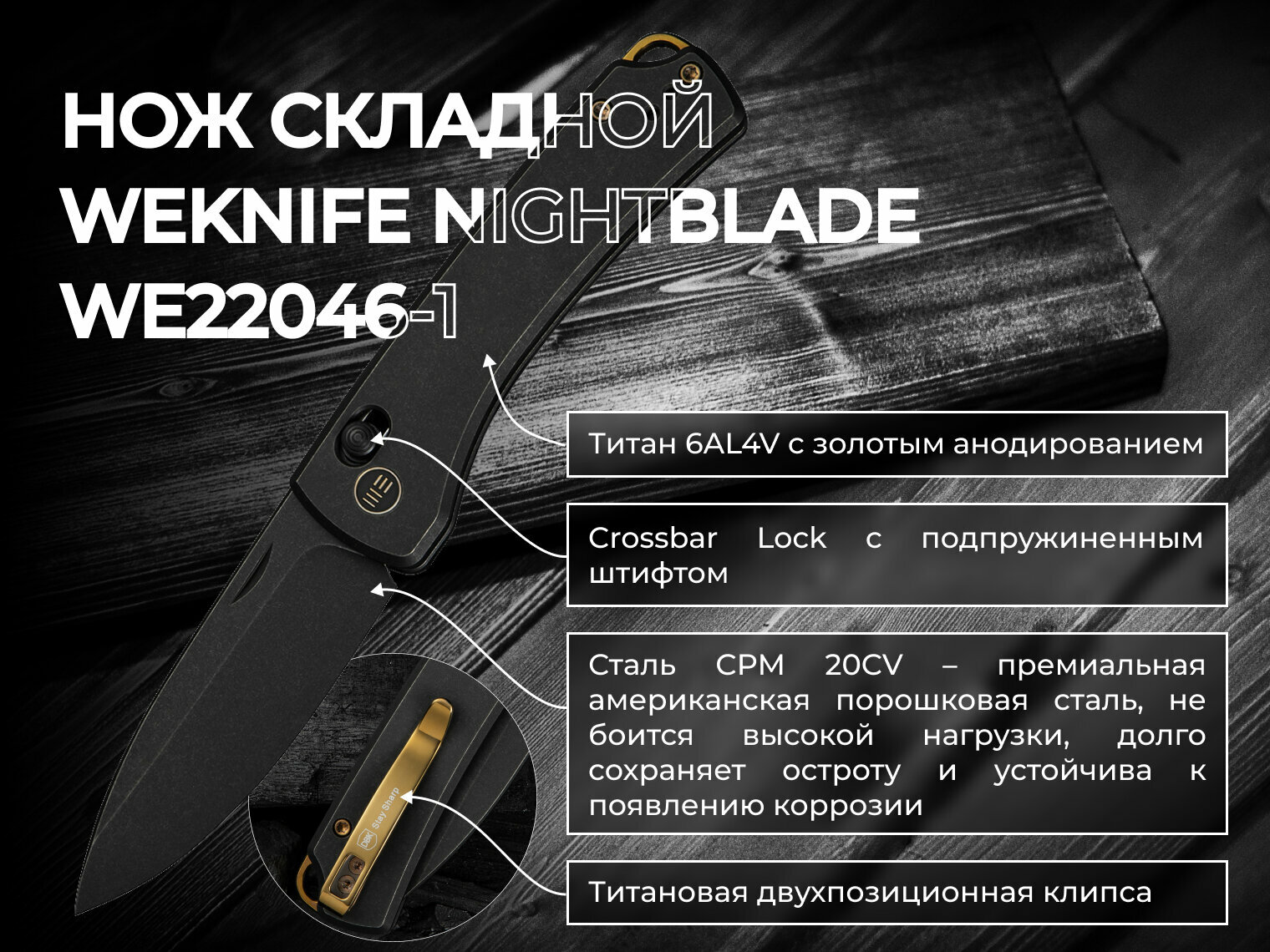 Складной нож Weknife Nightblade разработан в сотрудничестве с ножевыми мастерами Dutch Bushcraft Knives. Конструкция из премиальных материалов выдерживает высокие нагрузки: клинок из нержавеющей стали CPM 20CV, рукоять из титана 6AL4V. Осевой узел, карманная клипса и другие мелкие элементы имеют золотое анодирование. Замок Crossbar Lock с подпружиненным штифтом.