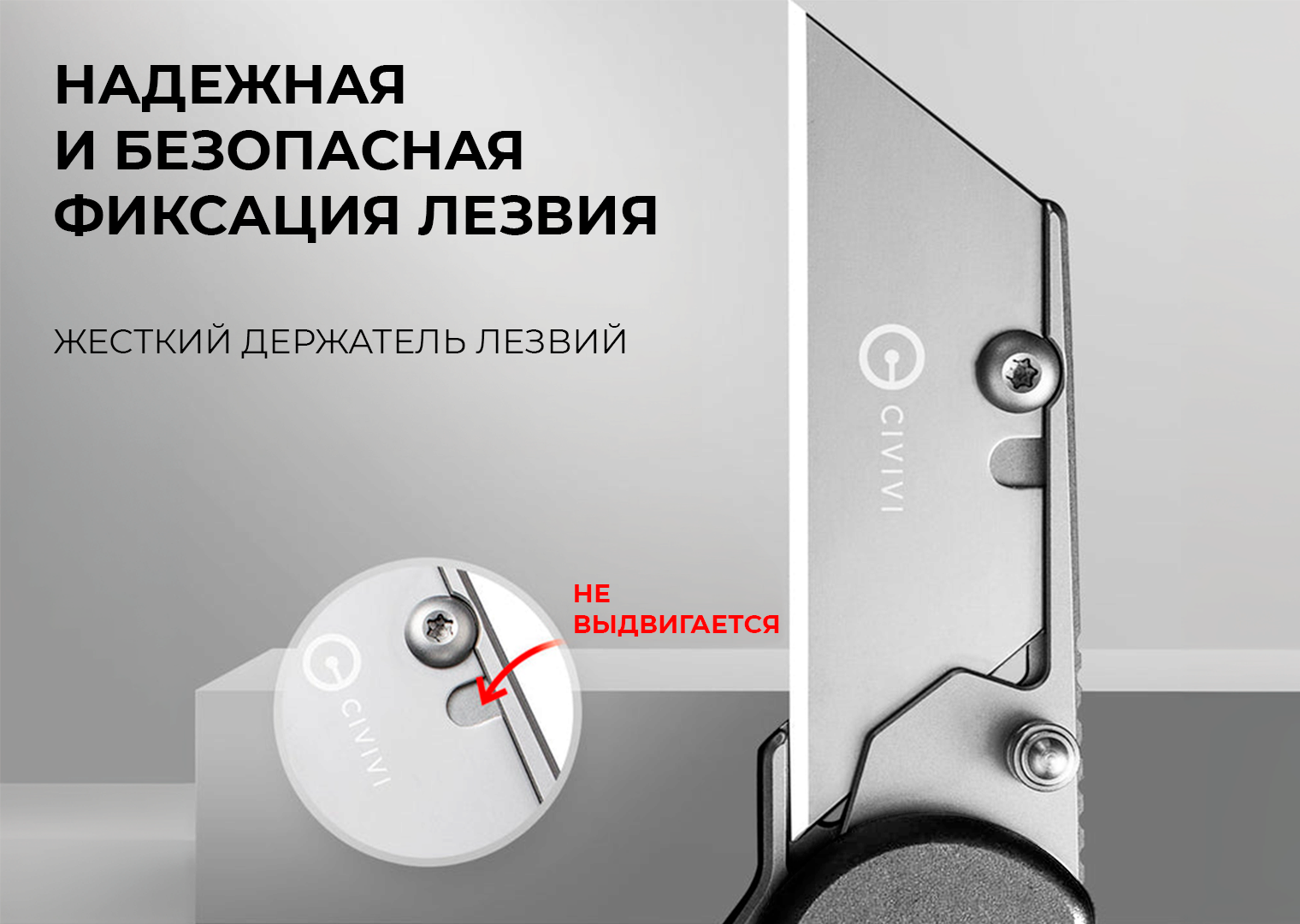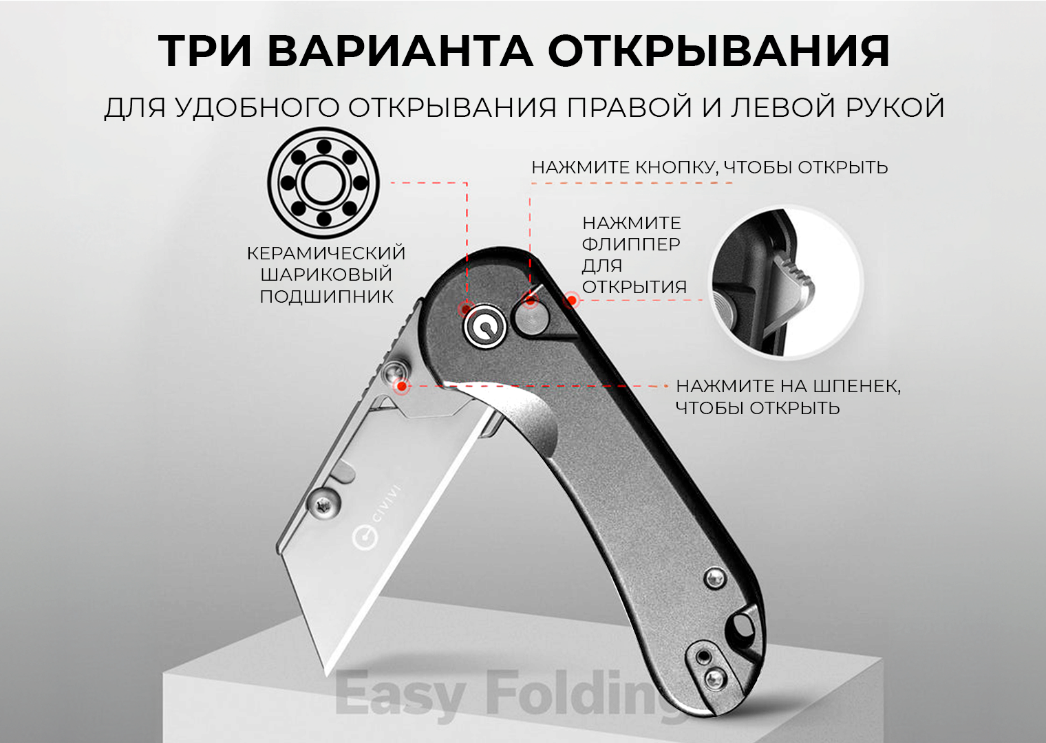 Эта модель является не самой обычной в ассортименте Civivi, поскольку она оснащена канцелярским ножом вместо классического клинка. В комплект входит 3 сменных лезвия. Все они изготовлены из нержавеющей стали 6Cr. Конструкция открывается 3 способами. Рукоять из алюминия дополнена двухпозиционной клипсой на карман.